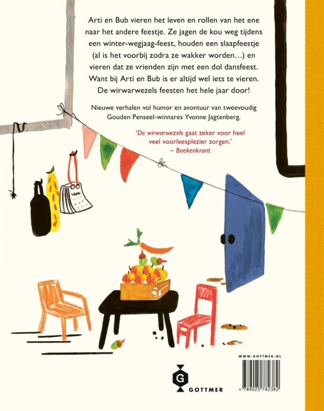 Na het succes van 'De wirwarwezels' en 'De wirwarwezels op weg!', waarin we de vriendschap, humor en conflicten van Arti en Bub leerden kennen, neemt dubbel Gouden Penseel-winnares Yvonne Jagtenberg ons mee op een nieuw avontuur. 'De wirwarwezels feesten!' is een heerlijk eigenzinnig en supergrappig kinderboek, een boek zoals alleen Yvonne Jagtenberg dat kan maken. Met haar gevoel voor humor en haar rake illustraties slaagt Jagtenberg erin complexe thema's op een toegankelijke manier aan te snijden. De boeken van de wirwarwezels zijn zonder twijfel de leukste voorleesboeken voor kinderen vanaf 5 jaar.