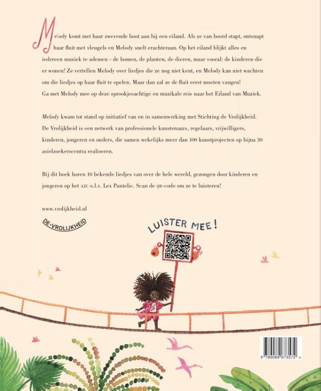 Het meisje Melody komt met haar zwevende boot aan bij een eiland. Haar gevleugelde fluit heeft haar de weg gewezen. Op het eiland blijkt alles en iedereen muziek te ademen: de bomen, de planten, de dieren, maar vooral: de kinderen die er wonen! Melody hoort liedjes in allerlei talen die ze niet kent, maar de taal van de muziek blijkt voor iedereen verstaanbaar. En Melody wil die liedjes maar wat graag leren ... Ga met Melody mee op deze sprookjesachtige en muzikale reis door alle windstreken.