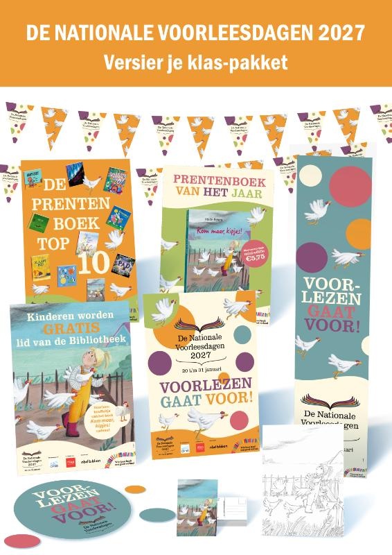 De Nationale Voorleesdagen 2027 vinden plaats van 20 tot en met 30 januari. Met dit pakket kunnen kinderdagverblijven en scholen hun klaslokaal of schoolbibliotheek prachtig versieren voor De Nationale Voorleesdagen! Deze materialen zijn een perfecte aanvulling op het Lespakket.
