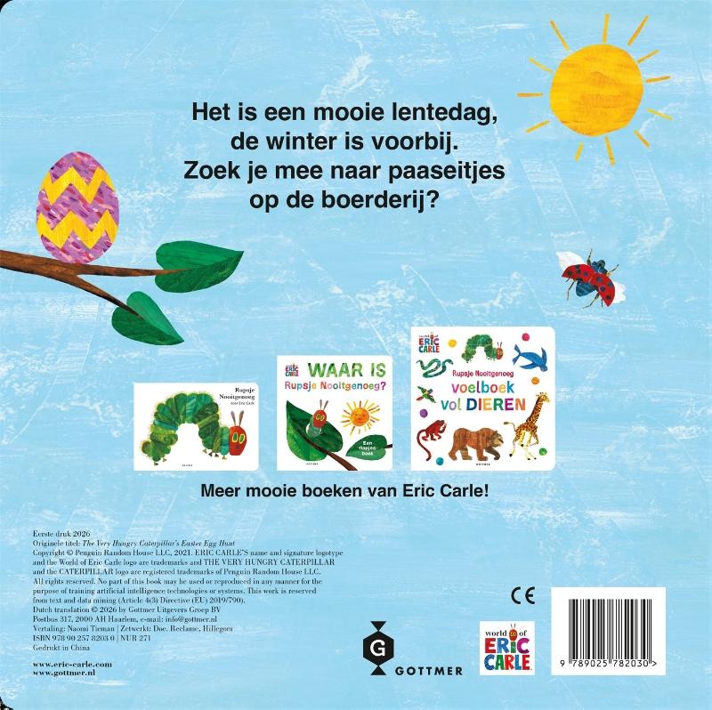 Pasen wordt nog vrolijker met Rupsje Nooitgenoeg! In dit vrolijke voorjaarsverhaal gaat Rupsje Nooitgenoeg op zoek naar paaseieren, ontmoet hij schattige voorjaarsdieren, zoals lammetjes en een konijn, en ontdekt hij kleurrijke verrassingen. Ga samen met Rupsje Nooitgenoeg op zoek naar de paaseieren in dit interactieve prentenboek over de lente, vol flapjes en lieve boerderijdieren. Til de stevige flapjes op om de rups te helpen met zoeken en ontdek samen de mooiste paaseieren die zijn verstopt op de boerderij. Kun jij ze allemaal vinden?