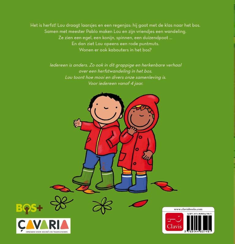 Iedereen is anders. Zo ook in dit grappige en herkenbare verhaal over een herfstwandeling in het bos. Lou toont hoe mooi en divers onze samenleving is. Voor iedereen vanaf 4 jaar. Het is herfst! Lou draagt laarsjes en een regenjas: hij gaat met de klas naar het bos. Samen met meester Pablo maken Lou en zijn vriendjes een wandeling. Ze zien een egel, een konijn, spinnen, een duizendpoot ... En dan ziet Lou opeens een rode puntmuts. Wonen er ook kabouters in het bos?