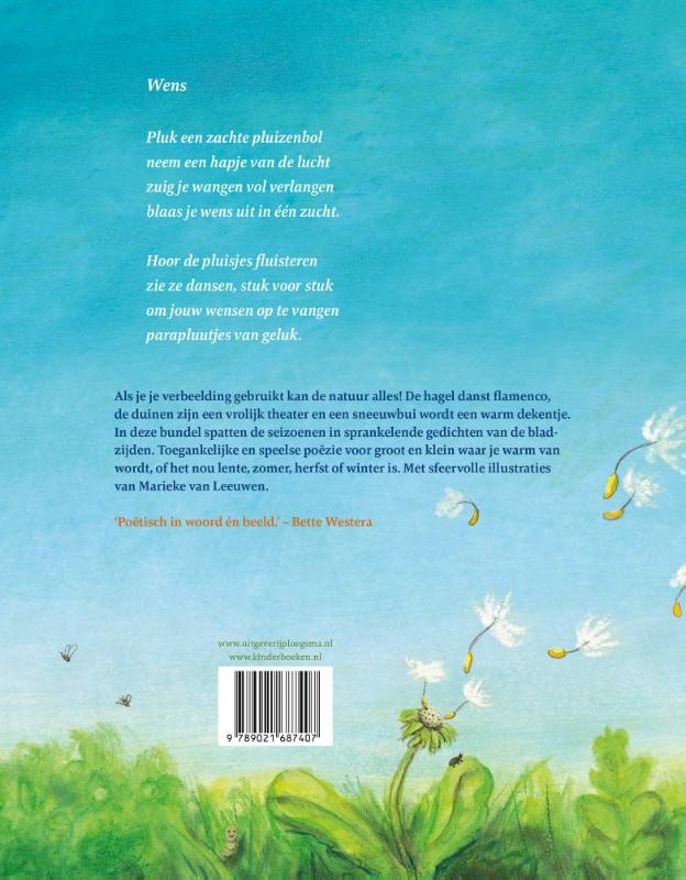 Als je je verbeelding gebruikt kan de natuur alles. De hagel danst flamenco, de duinen zijn een vrolijk theater en een sneeuwbui wordt een warm dekentje. In deze bundel spatten de seizoenen in 25 sprankelende gedichten van de bladzijden. Toegankelijke en speelse poëzie voor groot en klein waar je warm van wordt, of het nou lente, zomer, herfst of winter is.